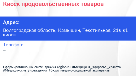 Киоск продовольственных товаров по адресу Волгоградская область, Камышин, Текстильная, 21в к1 киоск в дальнейшем Организация, размещена в следующих категориях: