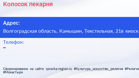 Колосок, пекарня по адресу Волгоградская область, Камышин, Текстильная, 21в киоск в дальнейшем Организация, размещена в следующих категориях: