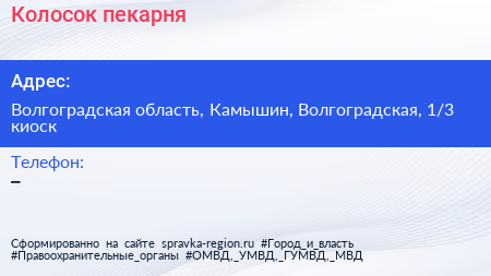 Колосок, пекарня по адресу Волгоградская область, Камышин, Волгоградская, 1/3 киоск в дальнейшем Организация, размещена в следующих категориях:
