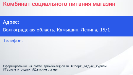 Комбинат социального питания, магазин по адресу Волгоградская область, Камышин, Ленина, 15/1 в дальнейшем Организация, размещена в следующих категориях:
