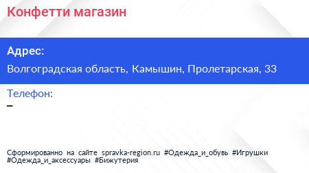 Конфетти, магазин по адресу Волгоградская область, Камышин, Пролетарская, 33 в дальнейшем Организация, размещена в следующих категориях: