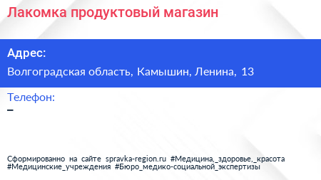 Лакомка, продуктовый магазин по адресу Волгоградская область, Камышин, Ленина, 13 в дальнейшем Организация, размещена в следующих категориях: