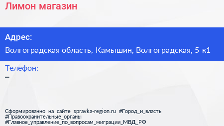 Лимон, магазин по адресу Волгоградская область, Камышин, Волгоградская, 5 к1 в дальнейшем Организация, размещена в следующих категориях: