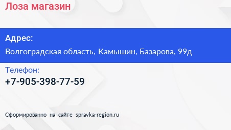 Лоза, магазин по адресу Волгоградская область, Камышин, Базарова, 99д в дальнейшем Организация, размещена в следующих категориях: