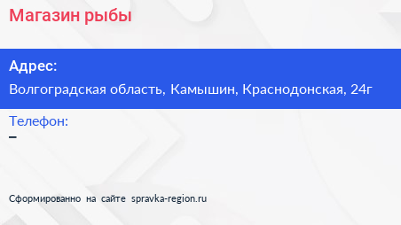 Магазин рыбы по адресу Волгоградская область, Камышин, Краснодонская, 24г в дальнейшем Организация, размещена в следующих категориях: