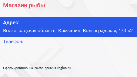 Магазин рыбы по адресу Волгоградская область, Камышин, Волгоградская, 1/3 к2 в дальнейшем Организация, размещена в следующих категориях: