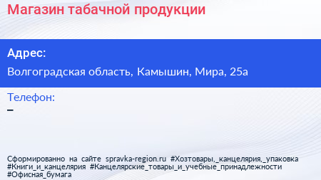 Магазин табачной продукции по адресу Волгоградская область, Камышин, Мира, 25а в дальнейшем Организация, размещена в следующих категориях: