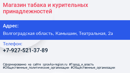 Магазин табака и курительных принадлежностей по адресу Волгоградская область, Камышин, Театральная, 2а в дальнейшем Организация, размещена в следующих категориях:
