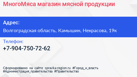 МногоМяса, магазин мясной продукции по адресу Волгоградская область, Камышин, Некрасова, 19к в дальнейшем Организация, размещена в следующих категориях: