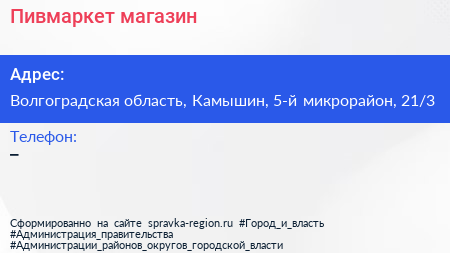 Пивмаркет, магазин по адресу Волгоградская область, Камышин, 5-й микрорайон, 21/3 в дальнейшем Организация, размещена в следующих категориях: