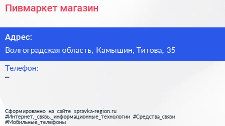 Пивмаркет, магазин по адресу Волгоградская область, Камышин, Титова, 35 в дальнейшем Организация, размещена в следующих категориях: