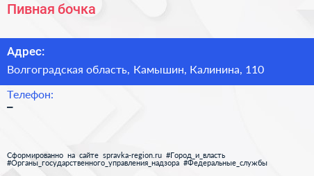 Пивная бочка по адресу Волгоградская область, Камышин, Калинина, 110 в дальнейшем Организация, размещена в следующих категориях: