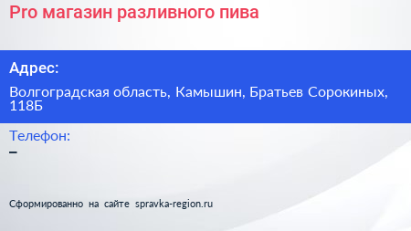 Pro, магазин разливного пива по адресу Волгоградская область, Камышин, Братьев Сорокиных, 118Б в дальнейшем Организация, размещена в следующих категориях: