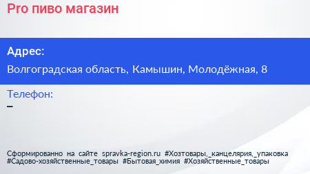 Pro пиво, магазин по адресу Волгоградская область, Камышин, Молодёжная, 8 в дальнейшем Организация, размещена в следующих категориях: