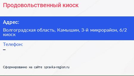 Продовольственный киоск по адресу Волгоградская область, Камышин, 3-й микрорайон, 6/2 киоск в дальнейшем Организация, размещена в следующих категориях: