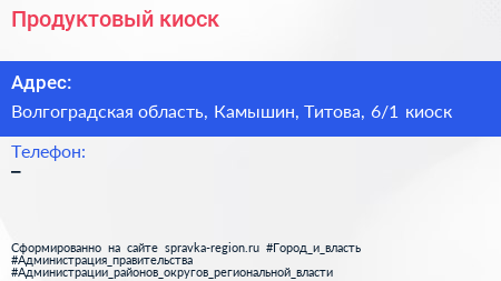 Продуктовый киоск по адресу Волгоградская область, Камышин, Титова, 6/1 киоск в дальнейшем Организация, размещена в следующих категориях: