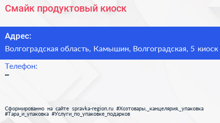 Смайк, продуктовый киоск по адресу Волгоградская область, Камышин, Волгоградская, 5 киоск в дальнейшем Организация, размещена в следующих категориях: