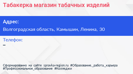Табакерка, магазин табачных изделий по адресу Волгоградская область, Камышин, Ленина, 30 в дальнейшем Организация, размещена в следующих категориях: