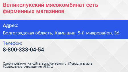 Великолукский мясокомбинат, сеть фирменных магазинов по адресу Волгоградская область, Камышин, 5-й микрорайон, 36 в дальнейшем Организация, размещена в следующих категориях:
