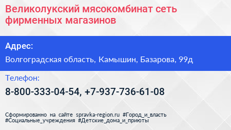 Великолукский мясокомбинат, сеть фирменных магазинов по адресу Волгоградская область, Камышин, Базарова, 99д в дальнейшем Организация, размещена в следующих категориях: