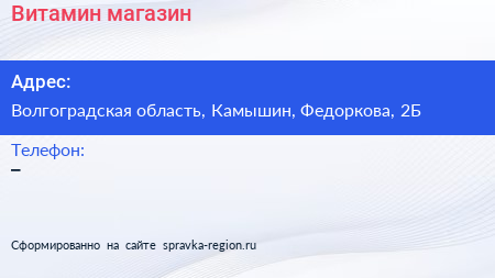 Витамин, магазин по адресу Волгоградская область, Камышин, Федоркова, 2Б в дальнейшем Организация, размещена в следующих категориях: