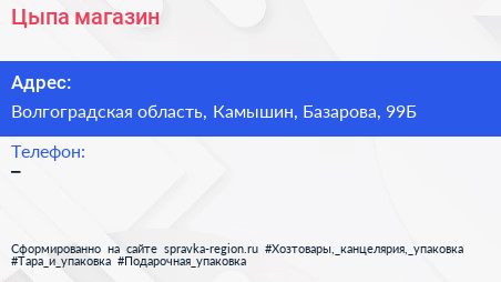 Цыпа, магазин по адресу Волгоградская область, Камышин, Базарова, 99Б в дальнейшем Организация, размещена в следующих категориях: