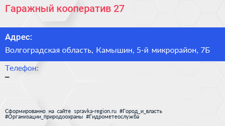 Гаражный кооператив №27 по адресу Волгоградская область, Камышин, 5-й микрорайон, 7Б в дальнейшем Организация, размещена в следующих категориях: