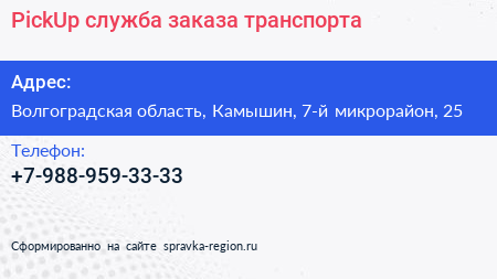 PickUp, служба заказа транспорта по адресу Волгоградская область, Камышин, 7-й микрорайон, 25 в дальнейшем Организация, размещена в следующих категориях: