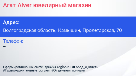 Агат Alver, ювелирный магазин по адресу Волгоградская область, Камышин, Пролетарская, 70 в дальнейшем Организация, размещена в следующих категориях: