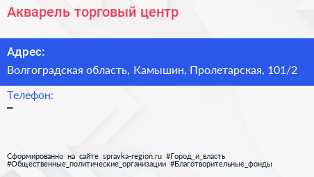 Акварель, торговый центр по адресу Волгоградская область, Камышин, Пролетарская, 101/2 в дальнейшем Организация, размещена в следующих категориях: