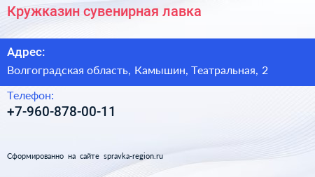 Кружказин, сувенирная лавка по адресу Волгоградская область, Камышин, Театральная, 2 в дальнейшем Организация, размещена в следующих категориях: