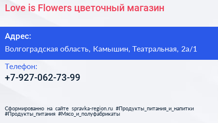 Love is... Flowers, цветочный магазин по адресу Волгоградская область, Камышин, Театральная, 2а/1 в дальнейшем Организация, размещена в следующих категориях:
