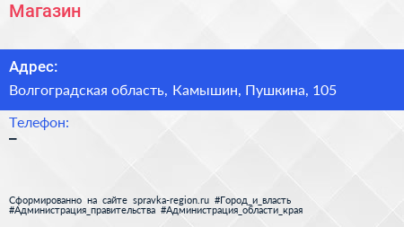 Магазин по адресу Волгоградская область, Камышин, Пушкина, 105 в дальнейшем Организация, размещена в следующих категориях: