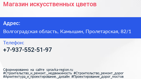 Магазин искусственных цветов по адресу Волгоградская область, Камышин, Пролетарская, 82/1 в дальнейшем Организация, размещена в следующих категориях: