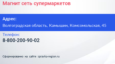 Магнит, сеть супермаркетов по адресу Волгоградская область, Камышин, Комсомольская, 45 в дальнейшем Организация, размещена в следующих категориях: