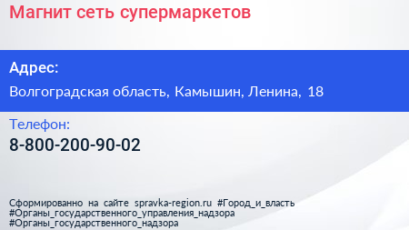 Магнит, сеть супермаркетов по адресу Волгоградская область, Камышин, Ленина, 18 в дальнейшем Организация, размещена в следующих категориях: