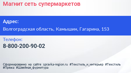 Магнит, сеть супермаркетов по адресу Волгоградская область, Камышин, Гагарина, 153 в дальнейшем Организация, размещена в следующих категориях: