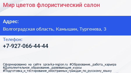 Мир цветов, флористический салон по адресу Волгоградская область, Камышин, Тургенева, 3 в дальнейшем Организация, размещена в следующих категориях: