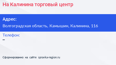 На Калинина, торговый центр по адресу Волгоградская область, Камышин, Калинина, 116 в дальнейшем Организация, размещена в следующих категориях: