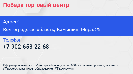 Победа, торговый центр по адресу Волгоградская область, Камышин, Мира, 25 в дальнейшем Организация, размещена в следующих категориях: