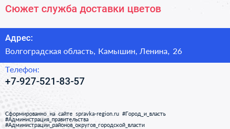 Сюжет, служба доставки цветов по адресу Волгоградская область, Камышин, Ленина, 26 в дальнейшем Организация, размещена в следующих категориях: