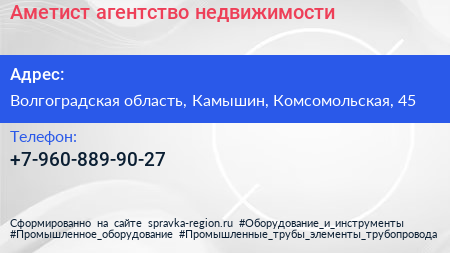 Аметист, агентство недвижимости по адресу Волгоградская область, Камышин, Комсомольская, 45 в дальнейшем Организация, размещена в следующих категориях: