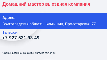 Домашний мастер, выездная компания по адресу Волгоградская область, Камышин, Пролетарская, 77 в дальнейшем Организация, размещена в следующих категориях: