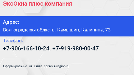 ЭкоОкна плюс, компания по адресу Волгоградская область, Камышин, Калинина, 73 в дальнейшем Организация, размещена в следующих категориях: