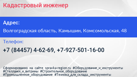 Кадастровый инженер по адресу Волгоградская область, Камышин, Комсомольская, 48 в дальнейшем Организация, размещена в следующих категориях:
