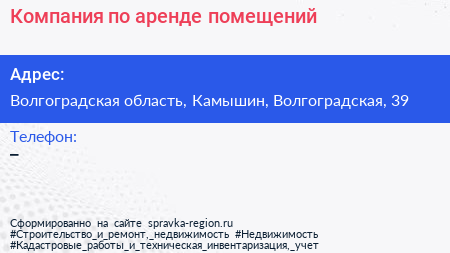Компания по аренде помещений по адресу Волгоградская область, Камышин, Волгоградская, 39 в дальнейшем Организация, размещена в следующих категориях: