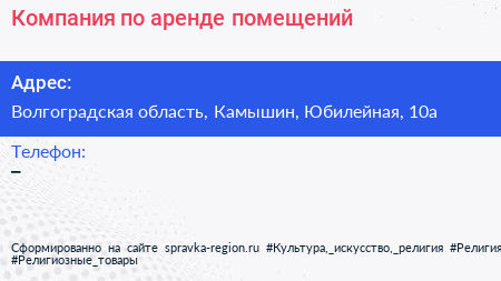Компания по аренде помещений по адресу Волгоградская область, Камышин, Юбилейная, 10а в дальнейшем Организация, размещена в следующих категориях: