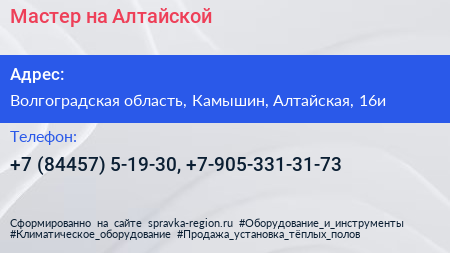 Мастер на Алтайской по адресу Волгоградская область, Камышин, Алтайская, 16и в дальнейшем Организация, размещена в следующих категориях: