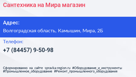 Сантехника на Мира, магазин по адресу Волгоградская область, Камышин, Мира, 2Б в дальнейшем Организация, размещена в следующих категориях: