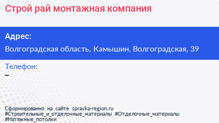 Строй-рай, монтажная компания по адресу Волгоградская область, Камышин, Волгоградская, 39 в дальнейшем Организация, размещена в следующих категориях: